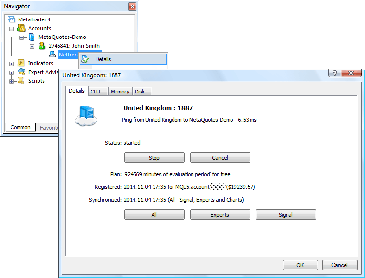 Renting a server is very easy and managing it does not take any effort. Starting, stopping, canceling hosting and control over usage of the virtual server resource are immediately available from MetaTrader. For that, a fully subscribed trading account Navigator features an icon with the location name and the state of the virtual server. Simply call the context menu and when you click on "Details" you will get the control and management dialog window.