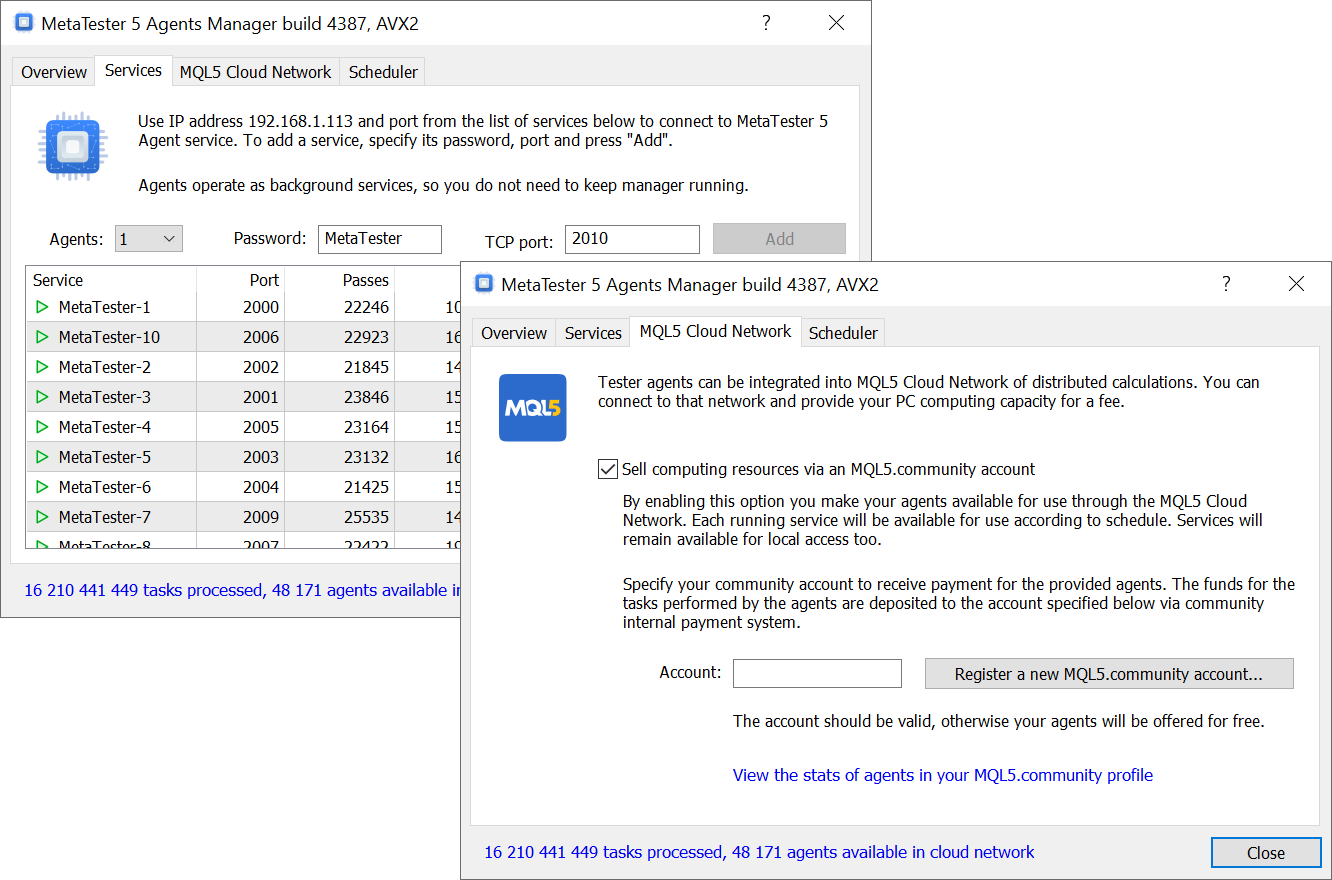All further operations of your installed agents will be automatic. The network will distribute tasks, collect results, and transfer payments for the completed work to your account daily. Monitor your agent operations using a detailed report. Join MQL5 Cloud Network and start earning.