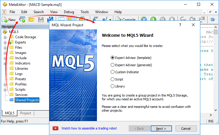 Creation of a new project is as easy as the creation of a normal MQL5 program. Click 'New Project', select the type of new program and specify properties (such as name, event handlers, etc) in the MQL5