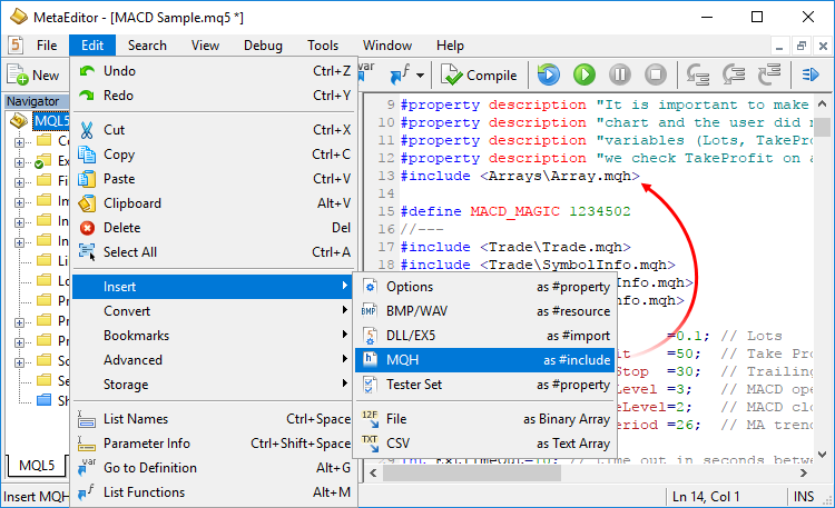 When a new include file is added to the source code, it also appears in the project Navigator. Used header files are added to the Headers section; images, sounds and other MQL5 programs used in the